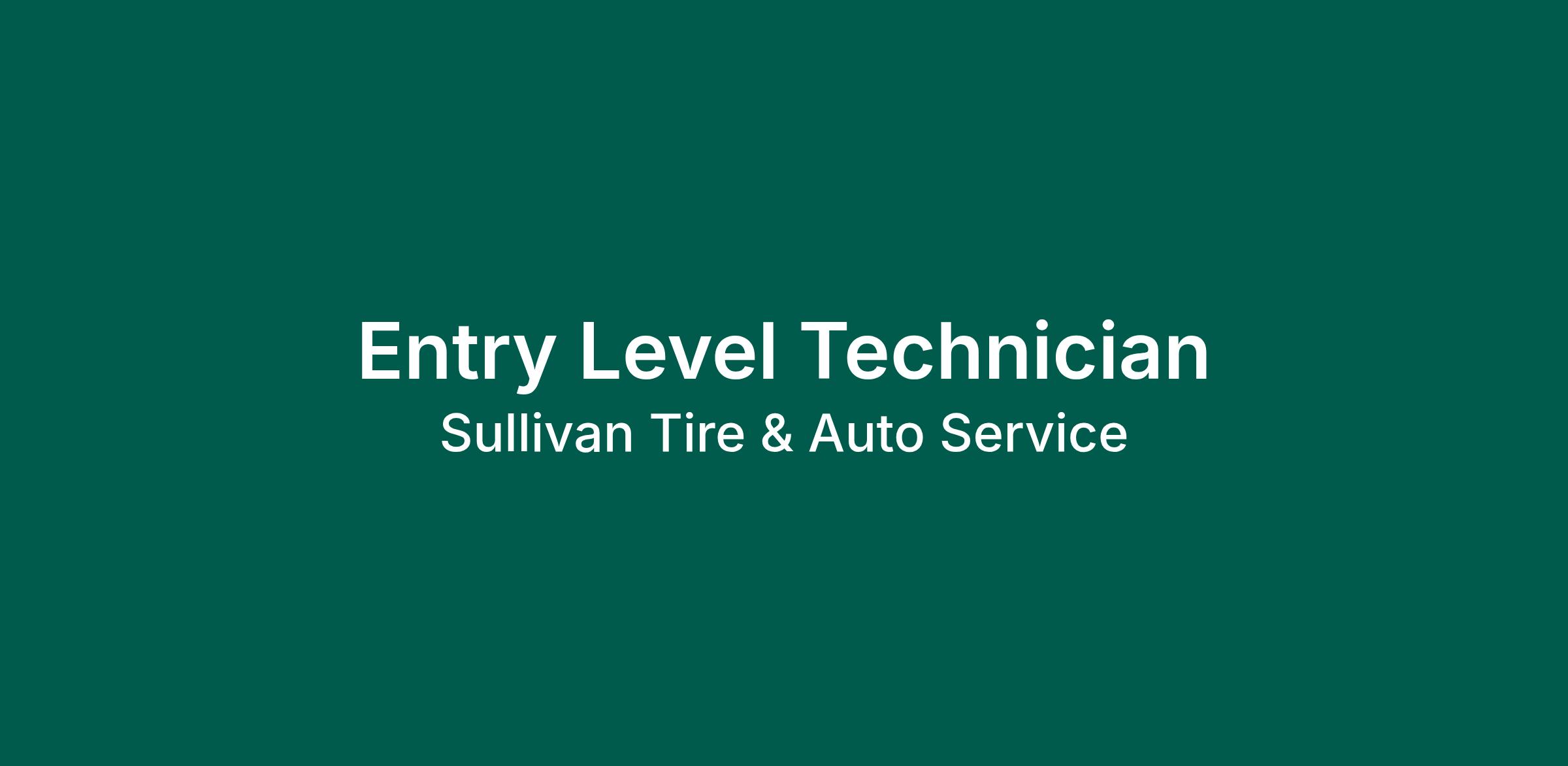 Sullivan Tire, an employee-owned company, currently has an opportunity to be an Entry Level Technician. The Entry Level Technician performs entry-level vehicle maintenance repairs and services on customersβ vehicles while delivering the highest quality and customer satisfaction. Work with store management to ensure productivity, profitability, and customer satisfaction standards are met. Adheres to internal controls, policies, and procedures.